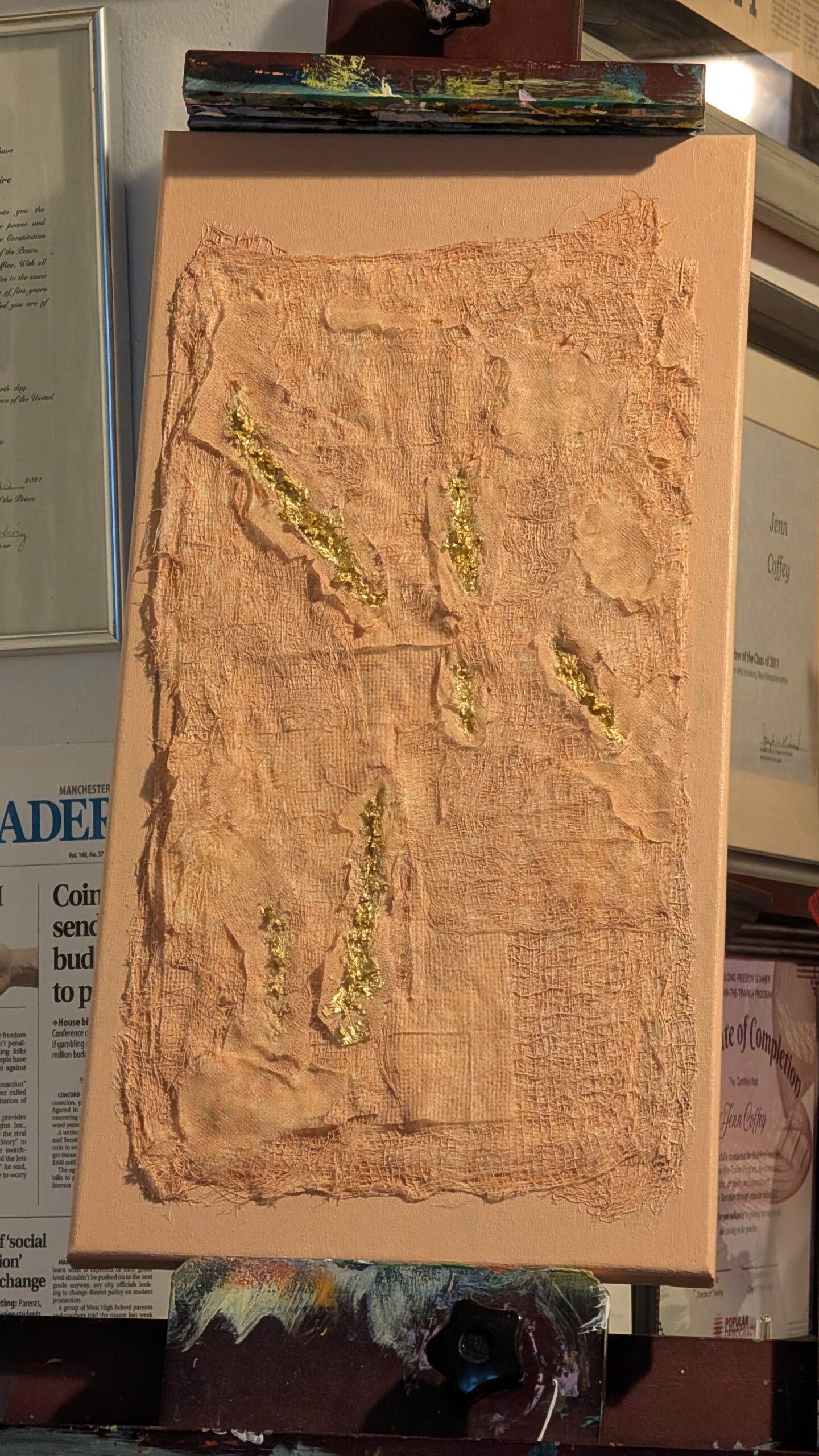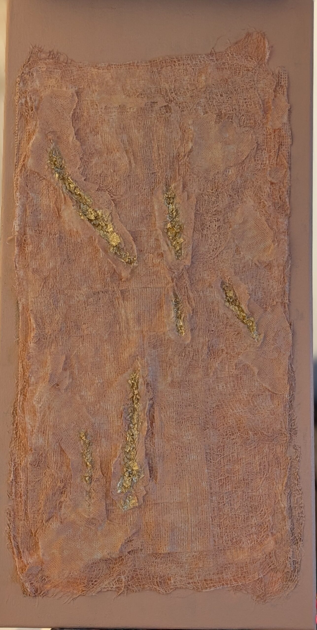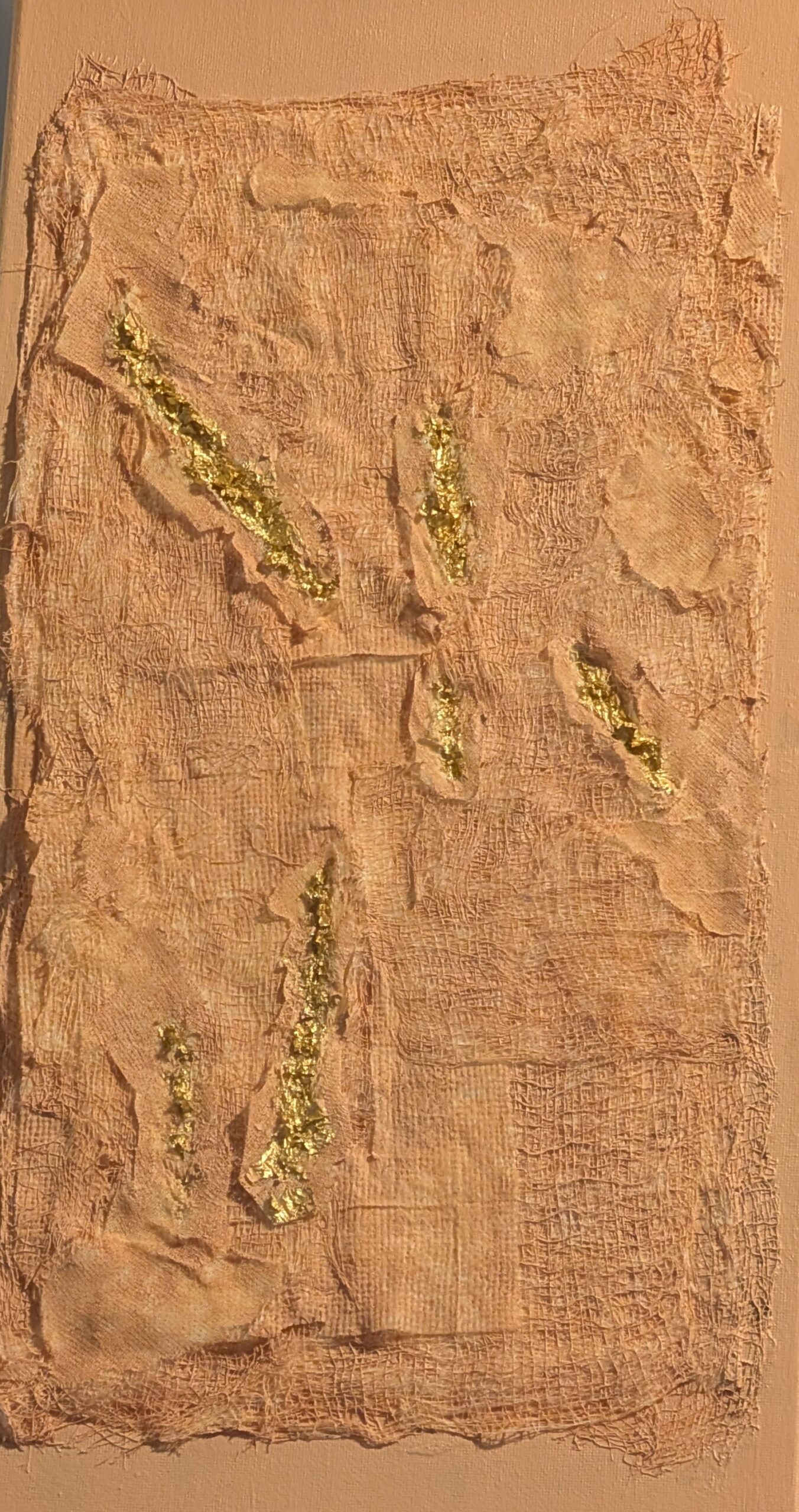 In Unmasked Healing, I utilize gauze-like textures and gold leaf to map the topography of the medicalized body. By placing gold directly into the “wounds” of the fabric, I refuse to obscure the evidence of struggle. Instead, I transform these ruptures into sites of profound value. For me, art-making is a grounding practice that provides a necessary sanctuary from physical symptoms; it is where I turn the sensory chaos of illness into a luminous record of persistence. This piece serves as a reminder that our most weathered layers are often where our greatest resilience—and our most brilliant light—is found.